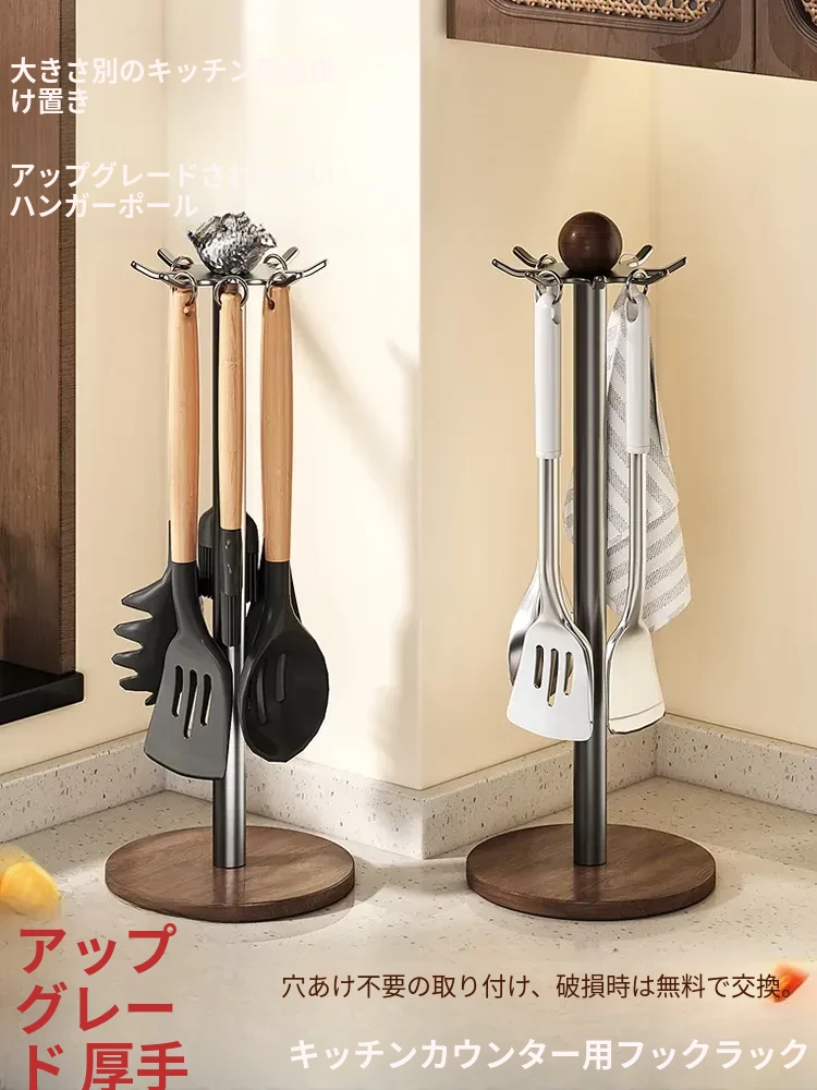 ウォールマウントフックキッチン収納ラック・無穴取り付け可能・くるくる回るクルミ木目デザイン・お玉やフライ返しをスマートに収納・おしゃれで便利なキッチンツールオーガナイザー