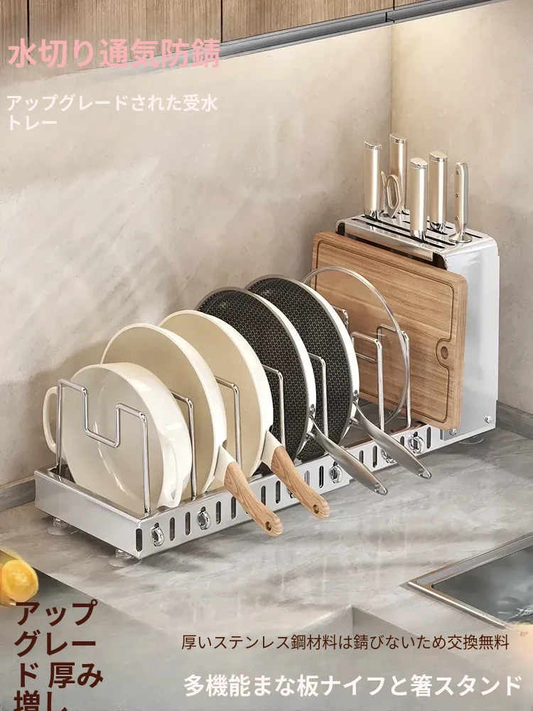 多機能キッチンナイフスタンド - 包丁、まな板、鍋蓋をすっきり収納!台面を有効活用し、料理をもっと楽しく便利に!