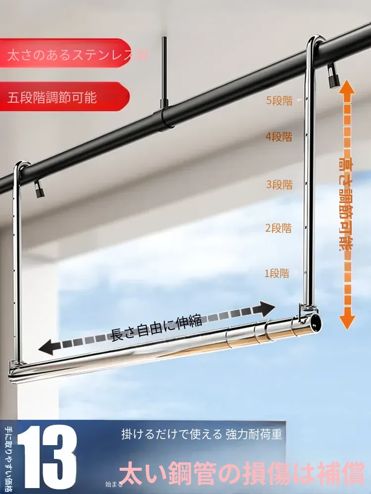 バルコニー用伸縮式物干し竿 - ステンレス製・穴あけ不要・昇降式で便利!布団も干せる魔法のハンガー。家庭での洗濯がもっと楽しくなるアイテム!