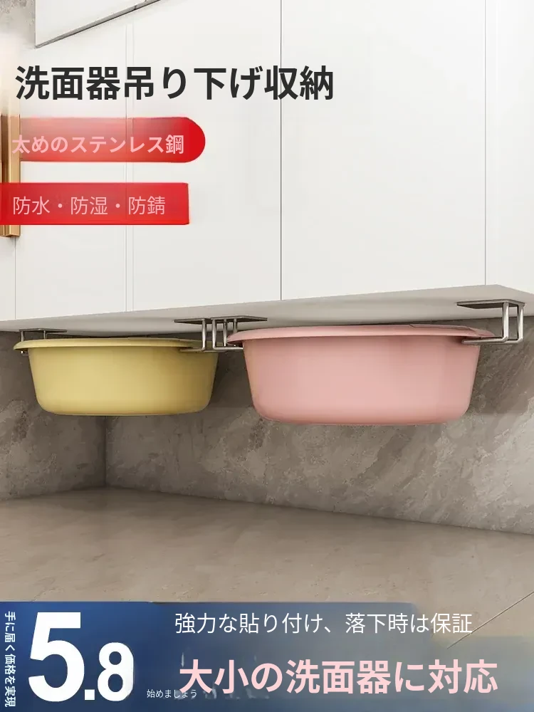 壁掛け洗面器フック - 穴あけ不要で簡単取り付け!バスルームやトイレでのスペースを有効活用できる収納ラック。洗面器をすっきり収納し、スッキリとした空間を実現する便利アイテムです!