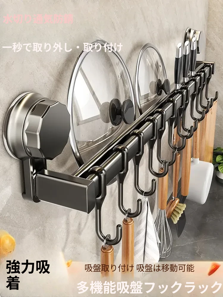 吸盤式キッチンフック収納ラック - 穴あけ不要!多機能で鍋、ヘラ、スプーン、包丁などを一体的に整理できる便利アイテム!キッチンをスッキリ整頓して、料理をもっと楽しく!