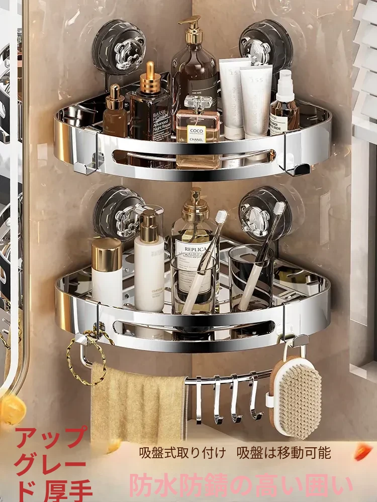 トイレ用吸盤式収納ラック - 穴あけ不要で簡単取り付け!バスルームや洗面台に最適な三角形デザインの壁掛けコーナー収納ラック。スッキリ整理整頓、スペースを有効活用!