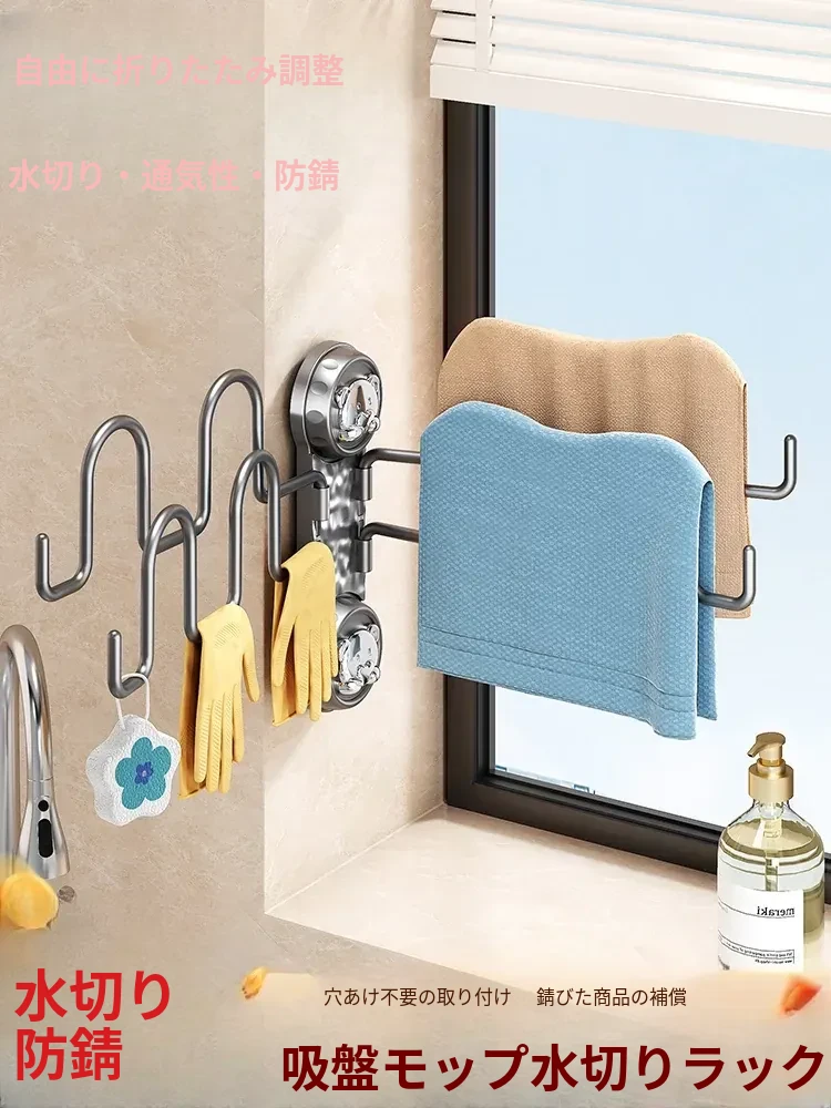 吸盤回転モップラック|キッチン壁掛け多機能ドライラック|タオル・スポンジも収納できる便利なマルチハンガー