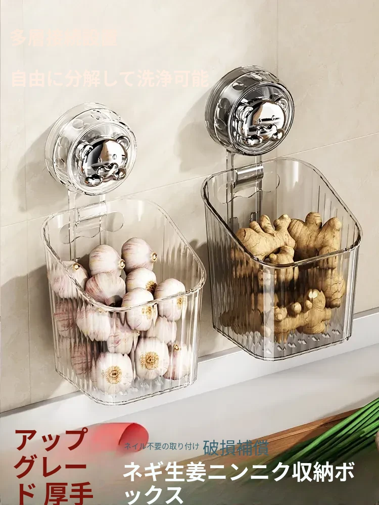 キッチン吸盤収納ラック 壁掛け葱・生姜・ニンニク収納ボックス 大蒜・生姜整理に最適な便利アイテム 穴を開けずに取り付け可能な調味料ハンギングバスケット