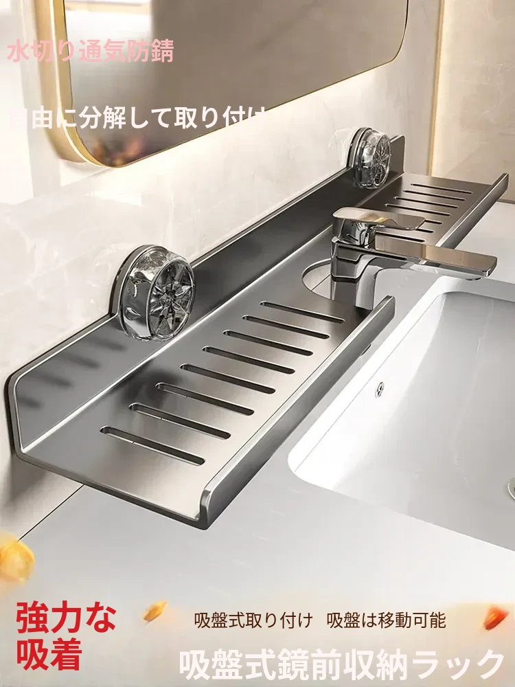 吸盤式ミラー前収納ラック|穴あけ不要で簡単取り付け!バスルームや洗面台に最適な収納ソリューション|洗面所・トイレの整理整頓に便利なアイテムです!