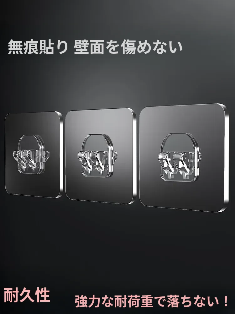 強力粘着フック|穴あけ不要で、寮・浴室・トイレ・キッチンに最適!壁に傷をつけず、簡単取り付けできるプラスチック製の無痕フック。衣類や小物の整理整頓をお手軽に実現!