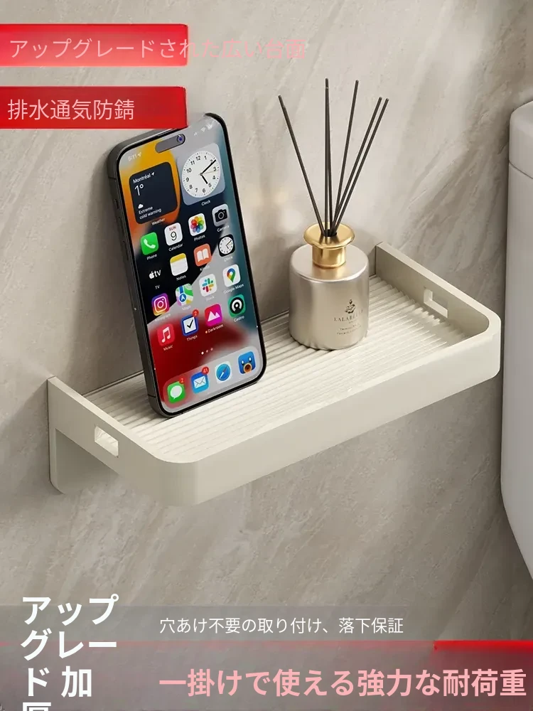 壁掛けトイレット収納棚 - おしゃれで便利なバスルーム&トイレ用!スマホスタンド付き、穴あけ不要で簡単取り付け、寮や小スペースにも最適なウォールシェルフ。整理整頓をサポートするアイテム!