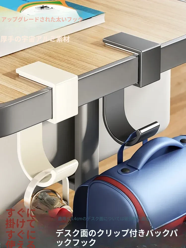 学生必見!デスクサイドに簡単取り付け、穴あけ不要のバッグフック!強力な耐荷重で、宿舎のデスク周りをすっきり整理整頓。便利な収納ラックで、学習環境を快適に!
